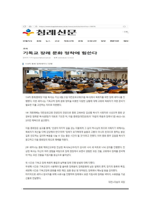 목회자대상 장례세미나 페이지 정보 작성자 최고관리자 댓글 0건 조회 295회 작성일 25-08-31 08:57 본문 침례신문 기사내용 목록 다음글기독교장례연구소 홈페이지 개설과 관련한 인사말 ! 25.08.25 댓글목록 댓글목록 등록된 댓글이 없습니다.